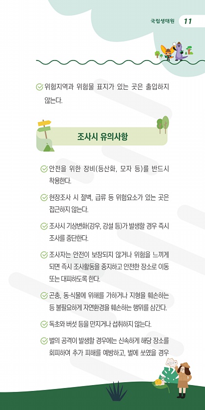 11 위험지역과 위험물 표지가 있는 곳은 출입하지 않는다. 안전을 위한 장비 등산화, 모자 등 를 반드시 착용한다. 현장조사 시 절벽, 급류 등 위험요소가 있는 곳은 접근하지 않는다. 조사시 기상변화 강우, 강설 등 가 발생할 경우 즉시 조사를 중단한다. 조사자는 안전이 보장되지 않거나 위험을 느끼게 되면 즉시 조사활동을 중지하고 안전한 장소로 이동 또는 대피하도록 한다. 곤충, 동·식물에 위해를 가하거나 지형을 훼손하는 등 불필요하게 자연환경을 훼손하는 행위를 삼간다. 독초와 버섯 등을 만지거나 섭취하지 않는다. 벌의 공격이 발생할 경우에는 신속하게 해당 장소를 회피하여 추가 피해를 예방하고, 벌에 쏘였을 경우 조사시유의사항