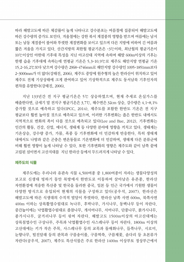 따라 해발고도에 따른 체감률이 높게 나타나고 강수분포는 여름철에 집중되어 해발고도에 따른 강수량의 증가도 보인다. 겨울철에는 강한 북서 계절풍의 영향을 받으며 여름에는 남서 또는 남동 계절풍이 불어와 뚜렷한 계절변화를 보이고 있으며 다른 지방에 비하여 긴 여름과 짧은 겨울을 가지고 있다. 산간지방의 최한월 평균기온은 -3℃이하, 최난월의 평균기온이 10℃이상인 아한대 기후대 특성을 지닌 아고산대 지역에 속하며 해발 600m이상의 기후는 한랭 습윤 기후대에 속하는데 연평균 기온은 5.3-10.9℃로 제주도 해안지방 연평균 기온 15.2-16.2℃보다 낮으며 강수량은 2968-4746mm로 해안지방 강수량인 1095-1851mm보다 2-3000mm가 더 많다 강태진, 2006 제주도 중앙에 원추형의 높은 한라산...