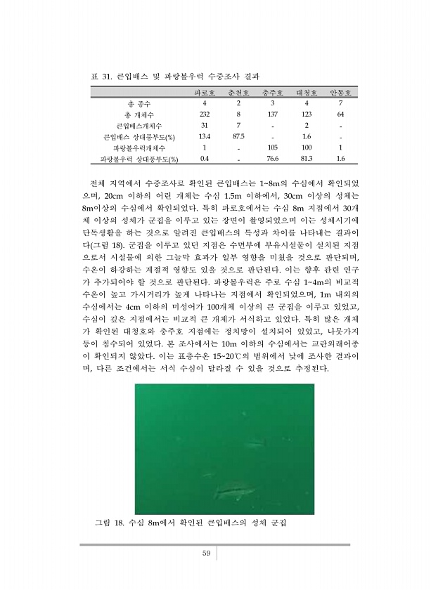59 파로호 춘천호 충주호 대청호 안동호 총 종수 4 2 3 4 7 총 개체수 232 8 137 123 64 큰입배스개체수 31 7 2 큰입배스 상대풍부도 % 13.4 87.5 1.6 파랑볼우럭개체수 1 105 100 1 파랑볼우럭 상대풍부도 % 0.4 76.6 81.3 1.6 표 31. 큰입배스 및 파랑볼우럭 수중조사 결과 전체 지역에서 수중조사로 확인된 큰입배스는 18m의 수심에서 확인되었 으며, 20cm 이하의 어린 개체는 수심 1.5m 이하에서, 30cm 이상의 성체는 8m이상의 수심에서 확인되었다. 특히 파로호에서는 수심 8m 지점에서 30개 체 이상의 성체가 군집을 이루고 있는 장면이 촬영되었으며 이는 성체시기에 단독생활을 하는 것으로 알려진 큰입배스의 특성과 차이를 나타내는 결과이 다 그림 18...