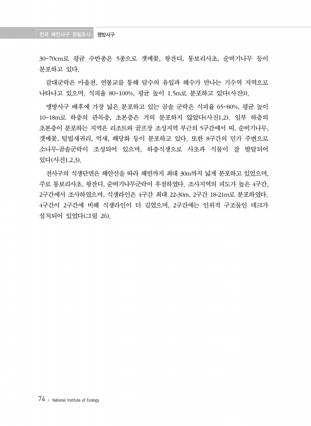 전국 해안사구 정밀조사 맹방사구 74 ? National Institute of Ecology 3070cm로 평균 수반종은 5종으로 갯메꽃, 왕잔디, 통보리사초, 순비기나무 등이 분포하고 있다. 갈대군락은 마읍천, 연봉교를 통해 담수의 유입과 해수가 만나는 기수역 지역으로 나타나고 있으며, 식피율 80100%, 평균 높이 1.5m로 분포하고 있다 사진9 맹방사구 배후에 가장 넓은 분포하고 있는 곰솔 군락은 식피율 6580%, 평균 높이 1018m로 하층의 관목층, 초본층은 거의 분포하지 않았다 사진1,2 일부 하층의 초본층이 분포하는 지역은 리조트와 골프장 조성지역 부근의 5구간에서 띠, 순비기나무, 갯메꽃, 털빕새귀리, 억새, 해당화 등이 분포하고 있다. 또한 8구간의 민가 주변으로 소나무-곰솔군락이 조성...