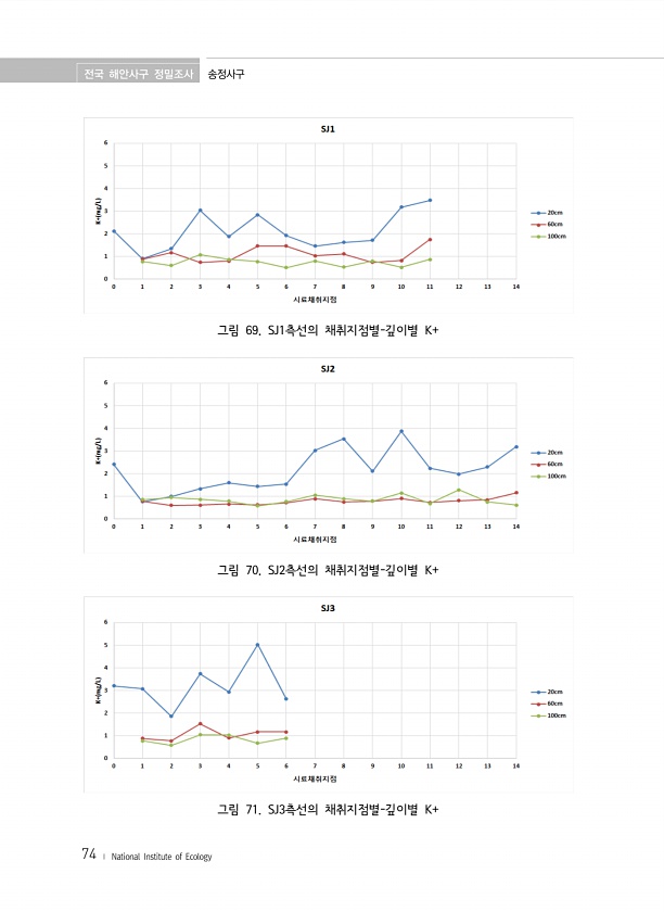 전국 해안사구 정밀조사 송정사구 74 ? National Institute of Ecology 그림 69. SJ1측선의 채취지점별-깊이별 K+ 그림 70. SJ2측선의 채취지점별-깊이별 K+ 그림 71. SJ3측선의 채취지점별-깊이별K+