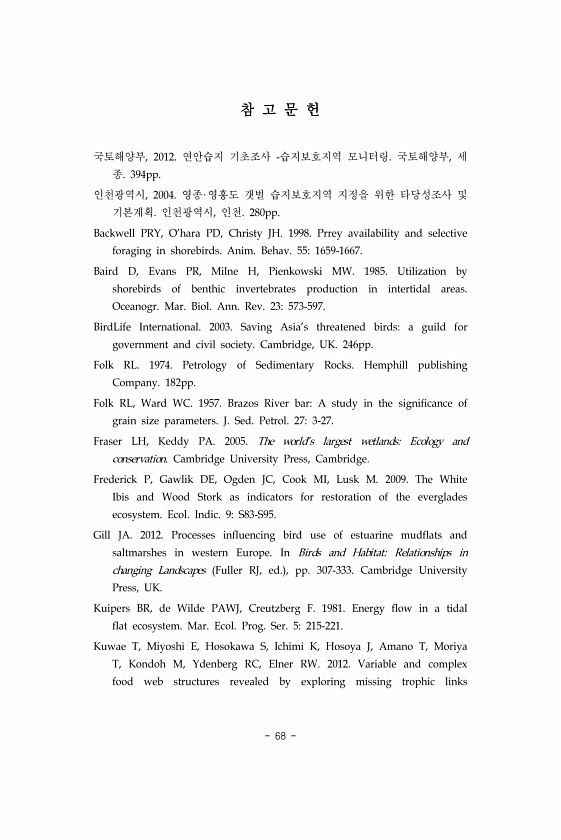 68 참 고 문 헌 국토해양부, 2012. 연안습지 기초조사 -습지보호지역 모니터링. 국토해양부, 세 종. 394pp. 인천광역시, 2004. 영종 영흥도 갯벌 습지보호지역 지정을 위한 타당성조사 및 기본계획. 인천광역시, 인천. 280pp. Backwell PRY, Ohara PD, Christy JH. 1998. Prrey availability and selective foraging in shorebirds. Anim. Behav. 551659-1667. Baird D, Evans PR, Milne H, Pienkowski MW. 1985. Utilization by shorebirds of benthic invertebrates production in intertidal areas. Oceanog...