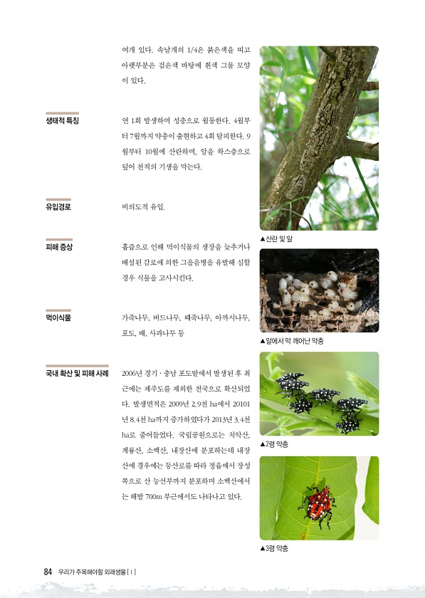 84 우리가 주목해야할 외래생물 [Ⅰ] 여개 있다. 속날개의 1/4은 붉은색을 띠고 아랫부분은 검은색 바탕에 흰색 그물 모양 이 있다. 생태적 특징 연 1회 발생하며 성충으로 월동한다. 4월부 터 7월까지 약충이 출현하고 4회 탈피한다. 9 월부터 10월에 산란하며, 알을 왁스층으로 덮어 천적의 기생을 막는다. 유입경로 비의도적 유입. 피해 증상 흡즙으로 인해 먹이식물의 생장을 늦추거나 배설된 감로에 의한 그을음병을 유발해 심할 경우 식물을 고사시킨다. 먹이식물 가죽나무, 버드나무, 때죽나무, 아까시나무, 포도, 배, 사과나무 등 국내 확산 및 피해 사례 2006년 경기 · 충남 포도밭에서 발생된 후 최 근에는 제주도를 제외한 전국으로 확산되었 다. 발생면적은 2009년 2.9천 ha에서 20101 년 8....