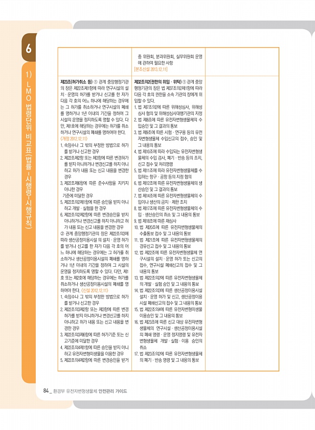 6 84 _ 환경부 유전자변형생물체 안전관리 가이드 1 L M O 법령단위 비교표 법률- 시행령- 시행규칙 제23조 허가취소 등 ① 관계 중앙행정기관 의 장은 제22조제1항에 따라 연구시설의 설 치ㆍ운영의 허가를 받거나 신고를 한 자가 다음 각 호의 어느 하나에 해당하는 경우에 는 그 허가를 취소하거나 연구시설의 폐쇄 를 명하거나 1년 이내의 기간을 정하여 그 시설의 운영을 정지하도록 명할 수 있다. 다 만, 제1호에 해당하는 경우에는 허가를 취소 하거나 연구시설의 폐쇄를 명하여야 한다. 개정 2012.12.11 1. 속임수나 그 밖의 부정한 방법으로 허가 를 받거나 신고한 경우 2. 제22조제2항 또는 제3항에 따른 변경허가 를 받지 아니하거나 변경신고를 하지 아니 하고 허가 내용 또는 신고 내용을 변경한...