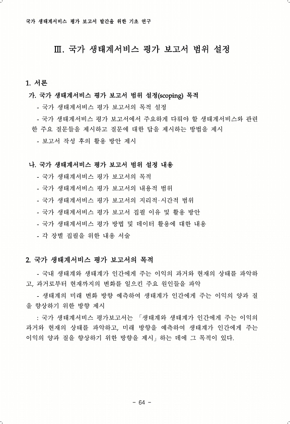 국가 생태계서비스 평가 보고서 발간을 위한 기초 연구 64 Ⅲ. 국가 생태계서비스 평가 보고서 범위 설정 1. 서론 가. 국가 생태계서비스 평가 보고서 범위 설정 scoping 목적 국가 생태계서비스 평가 보고서의 목적 설정 국가 생태계서비스 평가 보고서에서 주요하게 다뤄야 할 생태계서비스와 관련 한 주요 질문들을 제시하고 질문에 대한 답을 제시하는 방법을 제시 보고서 작성 후의 활용 방안 제시 나. 국가 생태계서비스 평가 보고서 범위 설정 내용 국가 생태계서비스 평가 보고서의 목적 국가 생태계서비스 평가 보고서의 내용적 범위 국가 생태계서비스 평가 보고서의 지리적 시간적 범위 국가 생태계서비스 평가 보고서 집필 이유 및 활용 방안 국가 생태계서비스 평가 방법 및 데이터 활용에 대한 내용 각 장별 집필을 위...