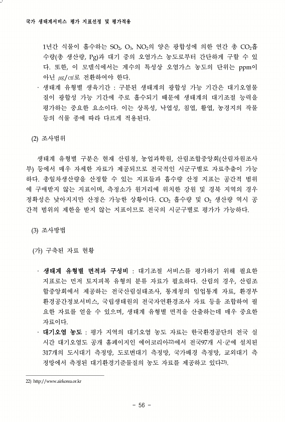 국가 생태계서비스 평가 지표선정 및 평가적용 56 1년간 식물이 흡수하는 SO2, O3, NO2의 양은 광합성에 의한 연간 총 CO2흡 수량 총 생산량, Pg 과 대기 중의 오염가스 농도로부터 간단하게 구할 수 있 다. 또한, 이 모델식에서는 계수의 특성상 오염가스 농도의 단위는 ppm이 아닌 ㎍/㎤로 전환하여야 한다. · 생태계 유형별 생육기간 구분된 생태계의 광합성 가능 기간은 대기오염물 질이 광합성 가능 기간에 주로 흡수되기 때문에 생태계의 대기조절 능력을 평가하는 중요한 요소이다. 이는 상록성, 낙엽성, 침엽, 활엽, 농경지의 작물 등의 식물 종에 따라 다르게 적용된다. 2 조사범위 생태계 유형별 구분은 현재 산림청, 농업과학원, 산림조합중앙회 산림자원조사 부 등에서 매우 자세한 자료가 제공되므로 전...