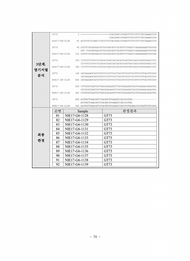 70 3단계. 염기서열 분석 최종 판정 순번 Sample 판정결과 81 NIE17-G6-1128 GT73 82 NIE17-G6-1129 GT73 83 NIE17-G6-1130 GT73 84 NIE17-G6-1131 GT73 85 NIE17-G6-1132 GT73 86 NIE17-G6-1133 GT73 87 NIE17-G6-1134 GT73 88 NIE17-G6-1135 GT73 89 NIE17-G6-1136 GT73 90 NIE17-G6-1137 GT73 91 NIE17-G6-1138 GT73 92 NIE17-G6-1139GT73
