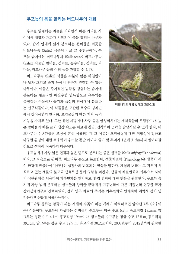담수생태계, 기후변화와 환경교란 83 우포늪의 봄을 알리는 버드나무의 개화 우포늪 일대에는 겨울을 지나면서 마른 가지들 사 이에서 개엽과 개화가 시작되어 봄을 알리는 나무가 있다. 습지 일대에 넓게 분포하는 선버들을 비롯한 버드나무속 Salix 식물이 바로 그 주인공이다. 우 포늪 습지에는 버드나무과 Salicaceae 버드나무속 Salix 식물인 왕버들, 선버들, 능수버들, 갯버들, 떡 버들, 버드나무 등의 여러 종을 관찰할 수 있다. 버드나무속 Salix 식물은 수분이 많은 하천변이 나 냇가 그리고 습지 등에서 흔하게 관찰할 수 있는 나무이다. 이들은 주기적인 범람을 경험하는 습지에 분포하는 대표적인 하천수변 연목림으로 유수역을 특징짓는 수목이자 습지와 육상의 전이대에 분포하 는 선구식물이다. 이 식물들...