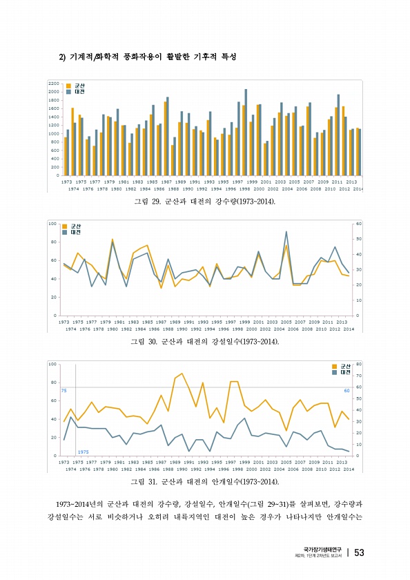 기계적 화학적 풍화작용이 활발한 기후적 특성 그림 29. 군산과 대전의 강수량 19732014 그림 30. 군산과 대전의 강설일수 19732014 그림 31. 군산과 대전의 안개일수 19732014 년의 군산과 대전의 강수량 강설일수 안개일수 그림 를 살펴보면 강수량과 강설일수는 서로 비슷하거나 오히려 내륙지역인 대전이 높은 경우가 나타나지만 안개일수는 국가장기생태연구 제2차, 1단계 2차년도 보고서 |53