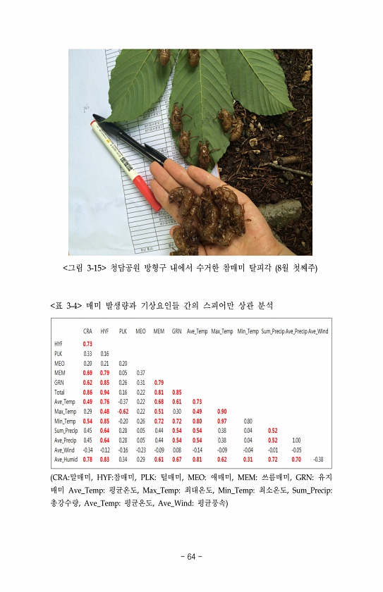 그림 3-15 청담공원 방형구 내에서 수거한 참매미 탈피각 8월 첫째주 CRA말매미, HYF참매미, PLK털매미, MEO애매미, MEM쓰름매미, GRN유지 매미 Ave_Temp평균온도, Max_Temp최대온도, Min_Temp최소온도, Sum_Precip총강수량, Ave_Temp평균온도, Ave_Wind평균풍속 표 3-4 매미 발생량과 기상요인들 간의 스피어만 상관 분석 64