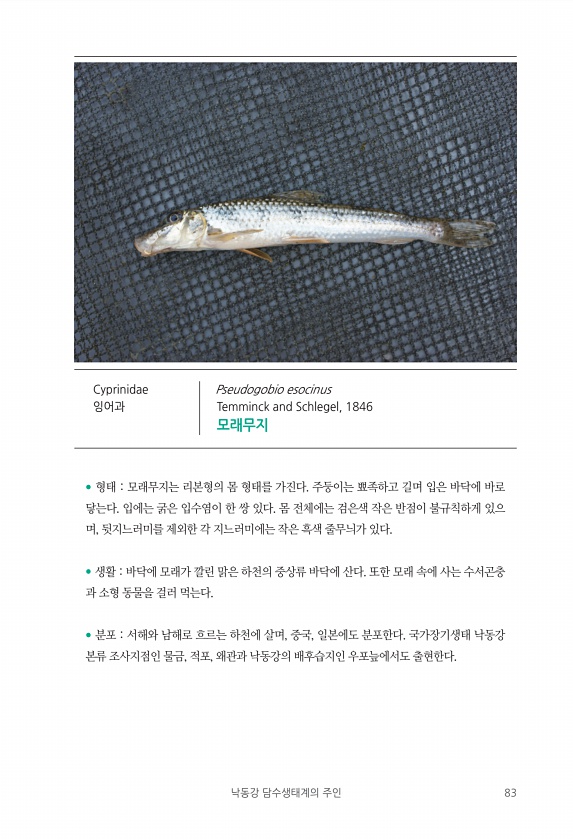 낙동강 담수생태계의 주인 83 ? 형태 모래무지는 리본형의 몸 형태를 가진다. 주둥이는 뾰족하고 길며 입은 바닥에 바로 닿는다. 입에는 굵은 입수염이 한 쌍 있다. 몸 전체에는 검은색 작은 반점이 불규칙하게 있으 며, 뒷지느러미를 제외한 각 지느러미에는 작은 흑색 줄무늬가 있다. ? 생활 바닥에 모래가 깔린 맑은 하천의 중상류 바닥에 산다. 또한 모래 속에 사는 수서곤충 과 소형 동물을 걸러 먹는다. ? 분포 서해와 남해로 흐르는 하천에 살며, 중국, 일본에도 분포한다. 국가장기생태 낙동강 본류 조사지점인 물금, 적포, 왜관과 낙동강의 배후습지인 우포늪에서도 출현한다. Cyprinidae 잉어과 Pseudogobio esocinus Temminck and Schlegel, 1846모래무지
