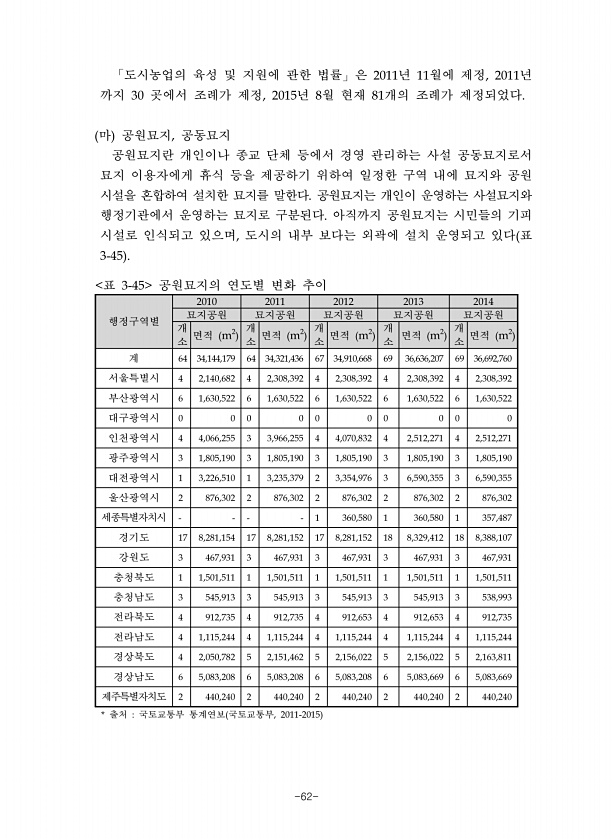 -62- 도시농업의 육성 및 지원에 관한 법률 은 년 월에 제정 년 까지 곳에서 조례가 제정 년 월 현재 개의 조례가 제정되었다 마 공원묘지 공동묘지 공원묘지란 개인이나 종교 단체 등에서 경영 관리하는 사설 공동묘지로서 묘지 이용자에게 휴식 등을 제공하기 위하여 일정한 구역 내에 묘지와 공원 시설을 혼합하여 설치한 묘지를 말한다 공원묘지는 개인이 운영하는 사설묘지와 행정기관에서 운영하는 묘지로 구분된다 아직까지 공원묘지는 시민들의 기피 시설로 인식되고 있으며 도시의 내부 보다는 외곽에 설치 운영되고 있다 표 행정구역별 묘지공원 묘지공원 묘지공원 묘지공원 묘지공원 개 소 면적 개 소 면적 개 소 면적 개 소 면적 개 소 면적 계 서울특별시 부산광역시 대구광역시 인천광역시 광주광역시 대전광역시 울산광역시 세종특...
