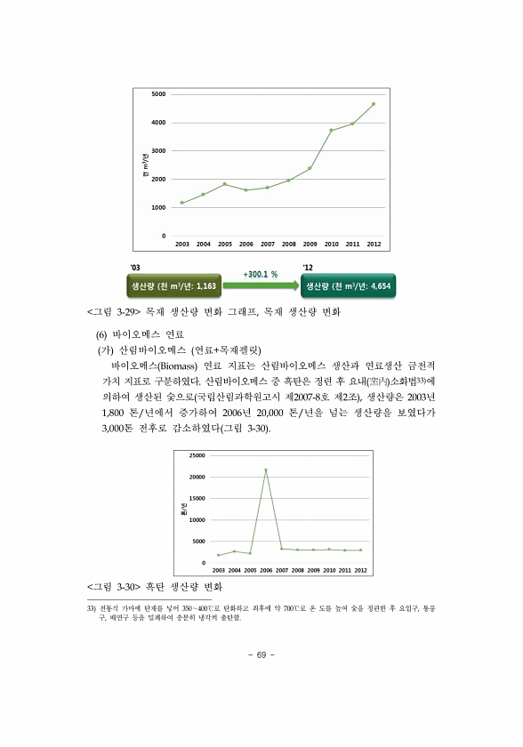 69 그림 3-29 목재 생산량 변화 그래프, 목재 생산량 변화 6 바이오메스 연료 가 산림바이오메스 연료+목재펠릿 바이오메스 Biomass 연료 지표는 산림바이오메스 생산과 연료생산 금전적 가치 지표로 구분하였다. 산림바이오메스 중 흑탄은 정련 후 요내 窯內 소화법33 에 의하여 생산된 숯으로 국립산림과학원고시 제2007-8호 제2조 , 생산량은 2003년 1,800 톤/년에서 증가하여 2006년 20,000 톤/년을 넘는 생산량을 보였다가 3,000톤 전후로 감소하였다 그림 3-30 그림 3-30 흑탄 생산량 변화 33 전통식 가마에 탄재를 넣어 350∼400℃로 탄화하고 최후에 약 700℃로 온 도를 높여 숯을 정련한 후 요입구, 통풍 구, 배연구 등을 밀폐하여 충분히 냉각켜출탄함.