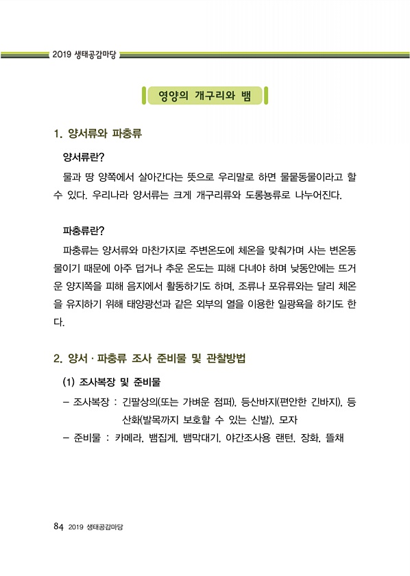 84 2019 생태공감마당 영양의 개구리와 뱀 1. 양서류와 파충류 양서류란? 물과 땅 양쪽에서 살아간다는 뜻으로 우리말로 하면 물뭍동물이라고 할 수 있다. 우리나라 양서류는 크게 개구리류와 도롱뇽류로 나누어진다. 파충류란? 파충류는 양서류와 마찬가지로 주변온도에 체온을 맞춰가며 사는 변온동 물이기 때문에 아주 덥거나 추운 온도는 피해 다녀야 하며 낮동안에는 뜨거 운 양지쪽을 피해 음지에서 활동하기도 하며, 조류나 포유류와는 달리 체온 을 유지하기 위해 태양광선과 같은 외부의 열을 이용한 일광욕을 하기도 한 다. 2. 양서·파충류 조사 준비물 및 관찰방법 1 조사복장 및 준비물 조사복장 긴팔상의 또는 가벼운 점퍼 , 등산바지 편안한 긴바지 , 등 산화 발목까지 보호할 수 있는 신발 , 모자 준비물 카메라, ...
