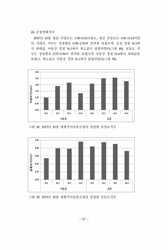 67 4 군집생태지수 2015년 10월 평균 다양도는 1.98±0.56이었고, 평균 균등도는 0.81±0.14이었 다. 다양도 지수는 정점별로 0.982.56의 편차를 보였으며, 금강 정점 St.3에 서 최대값, 낙동강 정점 St.1에서 최소값이 관찰되었다 그림 49 균등도 지 수는 정점별로 0.550.96의 편차를 보였으며 낙동강 정점 St.4에서 최대값을 보였고, 최소값은 낙동강 정점 St.1에서 관찰되었다 그림 50 그림 49. 2015년 10월 대형저서동물군집의 정점별 다양도지수 그림 50. 2015년 10월 대형저서동물군집의 정점별균등도지수