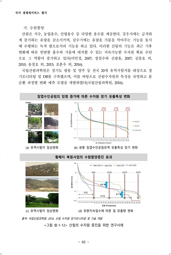 국가 생태계서비스 평가 66 가. 수원함양 산림은 식수, 농업용수, 산업용수 등 다양한 용수를 제공한다. 강우시에는 급격하 게 증가하는 유량을 감소시키며, 갈수기에는 유량을 가뭄을 막아주는 기능을 동시 에 수행하는 녹색 댐으로서의 기능을 하고 있다. 이러한 산림의 기능은 최근 기후 변화에 따른 빈번한 홍수와 가뭄에 대처할 수 있는 지속가능한 수자원 확보 수단 으로 그 역할이 증가하고 있다 이민경, 2007; 장철수와 신광용, 2007; 김종호 외, 2010; 송철호 외, 2015; 조흔우 외, 2016 국립산림과학원은 경기도 광릉 및 양주 등 전국 20개 유역시험지를 대상으로 장 기모니터링 및 DB를 구축했으며, 이를 바탕으로 산림수자원의 특성을 규명하고 물 순환 과정별 변화 예측 모델을 개발하였다 국립산림...