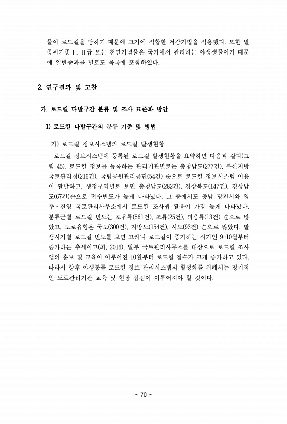 70 물이 로드킬을 당하기 때문에 크기에 적합한 저감기법을 적용했다. 또한 멸 종위기종Ⅰ, Ⅱ급 또는 천연기념물은 국가에서 관리하는 야생생물이기 때문 에 일반종과를 별로도 목록에 포함하였다. 2. 연구결과 및 고찰 가. 로드킬 다발구간 분류 및 조사 표준화 방안 1 로드킬 다발구간의 분류 기준 및 방법 가 로드킬 정보시스템의 로드킬 발생현황 로드킬 정보시스템에 등록된 로드킬 발생현황을 요약하면 다음과 같다 그 림 45 로드킬 정보를 등록하는 관리기관별로는 충청남도 277건 , 부산지방 국토관리청 216건 , 국립공원관리공단 54건 순으로 로드킬 정보시스템 이용 이 활발하고, 행정구역별로 보면 충청남도 282건 , 경상북도 147건 , 경상남 도 67건 순으로 접수빈도가 높게 나타났다. 그 중에서도 충남 당진...