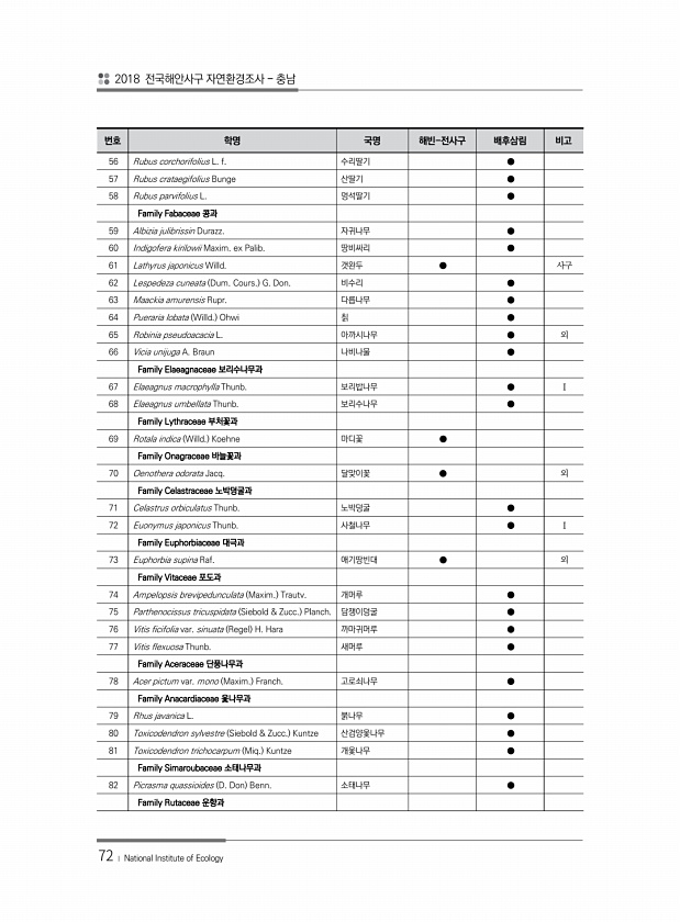 2018 전국해안사구 자연환경조사 충남 72 ? National Institute of Ecology 번호 학명 국명 해빈-전사구 배후삼림 비고 56 Rubus corchorifolius L. f. 수리딸기 ● 57 Rubus crataegifolius Bunge 산딸기 ● 58 Rubus parvifolius L. 멍석딸기 ● Family Fabaceae 콩과 59 Albizia julibrissin Durazz. 자귀나무 ● 60 Indigofera kirilowii Maxim. ex Palib. 땅비싸리 ● 61 Lathyrus japonicus Willd. 갯완두 ● 사구 62 Lespedeza cuneata Dum. Cours. G. Don. 비수리 ● 63 Maackia amurensis Rupr...