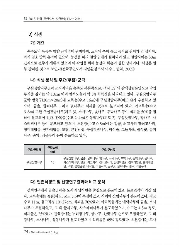 2018 전국 무인도서 자연환경조사 여수 1 74 ? National Institute of Ecology 2 손죽도의 북동쪽 방향 근거리에 위치하며, 도서의 폭이 좁고 동서로 길이가 긴 섬이다. 과거 염소 방목 흔적이 있으며, 능선을 따라 철탑 2 개가 설치되어 있고 철탑사이는 50m 간격으로 전주가 세워져 있으며 이 작업을 위해 능선의 훼손이 심한 상태이다. 식생은 일 부 관리된 것으로 보인다 전국무인도서 자연환경조사 여수 1 권역, 2009 구실잣밤나무군락 조사지역은 손죽도 북동쪽으로, 경사 15°의 갈색삼림토양으로 낙엽 부식층 깊이는 약 10cm 이며 암석노출이 약 5%의 특성을 나타내고 있다. 구실잣밤나무 군락 방형구 20m×20m 내 교목층 수고 16m 에 구실잣밤나무 피도 4 가 우점하고 있 으...