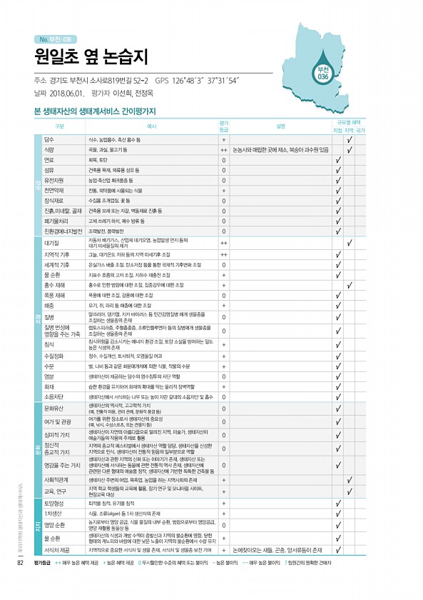 No. 부천- 본 생태자산의 생태계서비스 간이평가지 구분 예시 평가 등급 설명 규모별 혜택 지점 지역 국가 공급 담수 식수, 농업용수, 축산 용수 등 + √ 식량 곡물, 과실, 물고기 등 ++ 논농사와매립한곳에채소, 복숭아과수원있음 √ 연료 화목, 토탄 0 √ 섬유 건축용 목재, 의류용 섬유 등 0 √ 유전자원 농업·축산업 희귀품종 등 0 √ 천연약재 전통, 의약품에 사용되는 식물 + √ 장식재료 수집용 조개껍질, 꽃 등 0 √ 진흙,미네랄, 골재 건축용 모래 또는 자갈, 벽돌재료 진흙 등 0 √ 폐기물처리 고체 쓰레기 하치, 폐수 방류 등 0 √ 친환경에너지발전 조력발전, 풍력발전 0 √ 조절 대기질 자동차 배기가스, 산업체 대기오염, 농업발생 먼지 등의 대기 미세물질의 제거 ++ √ 지역적 기후 그늘, ...