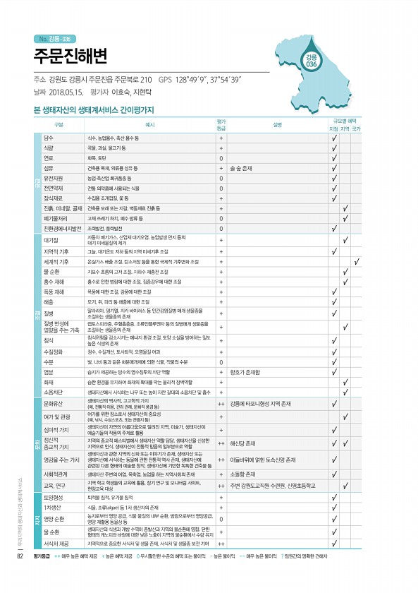 No. 강릉- 강릉 036 본 생태자산의 생태계서비스 간이평가지 구분 예시 평가 등급 설명 규모별 혜택 지점 지역 국가 공급 담수 식수, 농업용수, 축산 용수 등 + √ 식량 곡물, 과실, 물고기 등 + √ 연료 화목, 토탄 0 √ 섬유 건축용 목재, 의류용 섬유 등 + 솔 숲 존재 √ 유전자원 농업·축산업 희귀품종 등 0 √ 천연약재 전통 의약품에 사용되는 식물 0 √ 장식재료 수집용 조개껍질, 꽃 등 + √ 진흙, 미네랄, 골재 건축용 모래 또는 자갈, 벽돌재료 진흙 등 + √ 폐기물처리 고체 쓰레기 하치, 폐수 방류 등 0 √ 친환경에너지발전 조력발전, 풍력발전 0 √ 조절 대기질 자동차 배기가스, 산업체 대기오염, 농업발생 먼지 등의 대기 미세물질의 제거 + √ 지역적 기후 그늘, 대기온도 저하 등의...