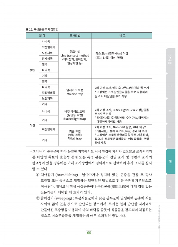 85 제5차 전국자연환경조사 지침 나비목 딱정벌레목 노린재목 잠자리목 벌목 파리목 기타 벌목 파리목 딱정벌레목 노린재목 기타 나비목 기타 딱정벌레목 기타 분?야 조사방법 비?고 주간 야간 선조사법 Line transect method 채어잡기, 쓸어잡기, 현장확인?등 말레이즈?트랩 Malaise trap 버킷?라이트?트랩 유인등?트랩 Bucket light trap 핏폴?트랩 함정?트랩 Pitfall trap 최소 2km 왕복 4km 이상 또는 1시간?이상?거리 표 15. 육상곤충류?채집방법 2회?이상?조사, 설치?후 2주 14일 경과?뒤?수거 * 고정액은?프로필렌글리콜을?주로?사용하며, 필요?시?에틸알콜?추가?사용 2회?이상?조사, Black Light 12W 이상 , 일몰 후 4시간?이상 * 타이머?세팅...
