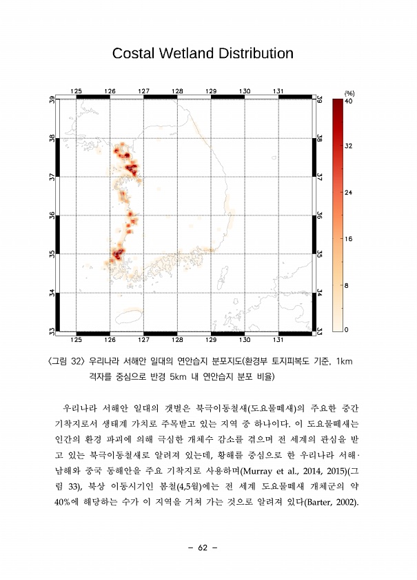 62 그림 32 우리나라 서해안 일대의 연안습지 분포지도 환경부 토지피복도 기준, 1km 격자를 중심으로 반경 5km 내 연안습지 분포 비율 우리나라 서해안 일대의 갯벌은 북극이동철새 도요물떼새 의 주요한 중간 기착지로서 생태계 가치로 주목받고 있는 지역 중 하나이다. 이 도요물떼새는 인간의 환경 파괴에 의해 극심한 개체수 감소를 겪으며 전 세계의 관심을 받 고 있는 북극이동철새로 알려져 있는데, 황해를 중심으로 한 우리나라 서해· 남해와 중국 동해안을 주요 기착지로 사용하며 Murray et al., 2014, 2015 그 림 33 , 북상 이동시기인 봄철 4,5월 에는 전 세계 도요물떼새 개체군의 약 40%에 해당하는 수가 이 지역을 거쳐 가는 것으로 알려져 있다 Barter, 2002