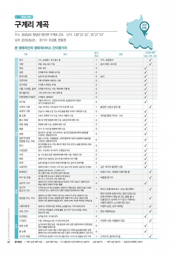 No. 창녕- 창녕 036 본 생태자산의 생태계서비스 간이평가지 구분 예시 평가 등급 설명 규모별 혜택 지점 지역 국가 공급 담수 식수, 농업용수, 축산 용수 등 + 식수, 농업용수 √ 식량 곡물, 과실, 물고기 등 + 송이 채취, 과수원 √ 연료 화목, 토탄 0 √ 섬유 건축용 목재, 의류용 섬유 등 0 √ 유전자원 농업·축산업 희귀품종 등 0 송이 √ 천연약재 전통 의약품에 사용되는 식물 0 √ 장식재료 수집용 조개껍질, 꽃 등 0 √ 진흙, 미네랄, 골재 건축용 모래 또는 자갈, 벽돌재료 진흙 등 0 √ 폐기물처리 고체 쓰레기 하치, 폐수 방류 등 0 √ 친환경에너지발전 조력발전, 풍력발전 0 √ 조절 대기질 자동차 배기가스, 산업체 대기오염, 농업발생 먼지 등의 대기 미세물질의 제거 0 √ 지역적 기...