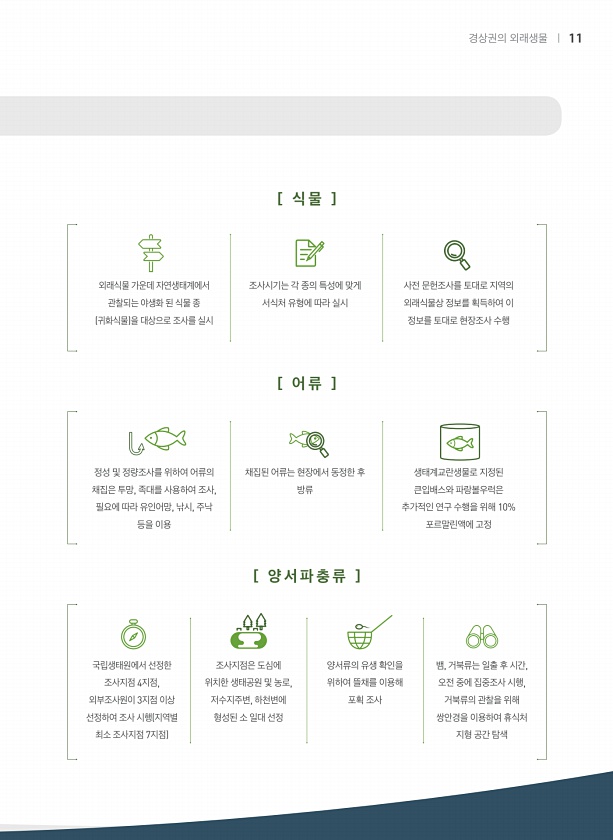 [ 양 서 파 충 류 ] 국립생태원에서 선정한 조사지점 4지점, 외부조사원이 3지점 이상 선정하여 조사 시행 지역별 최소 조사지점 7지점 조사지점은 도심에 위치한 생태공원 및 농로, 저수지주변, 하천변에 형성된 소 일대 선정 양서류의 유생 확인을 위하여 뜰채를 이용해 포획 조사 뱀, 거북류는 일출 후 시간, 오전 중에 집중조사 시행, 거북류의 관찰을 위해 쌍안경을 이용하여 휴식처 지형 공간 탐색 [ 어 류 ] 채집된 어류는 현장에서 동정한 후 방류 생태계교란생물로 지정된 큰입배스와 파랑볼우럭은 추가적인 연구 수행을 위해 10% 포르말린액에 고정 정성 및 정량조사를 위하여 어류의 채집은 투망, 족대를 사용하여 조사, 필요에 따라 유인어망, 낚시, 주낙 등을 이용 [ 식 물 ] 조사시기는 각 종의 특성에 맞게 ...