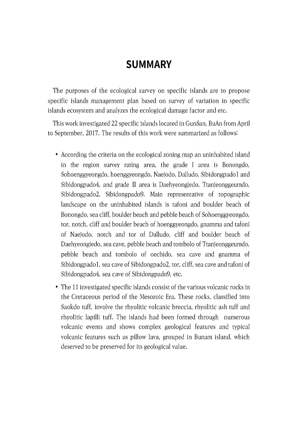 SUMMARY The purposes of the ecological survey on specific islands are to propose specific islands management plan based on survey of variation in specific islands ecosystem and analyzes the ecological damage factor and etc. This work investigated 22 specific islands located in GunSan, BuAn from April to September, 2017. The results of this work were summarized as follows? According the criteria on...