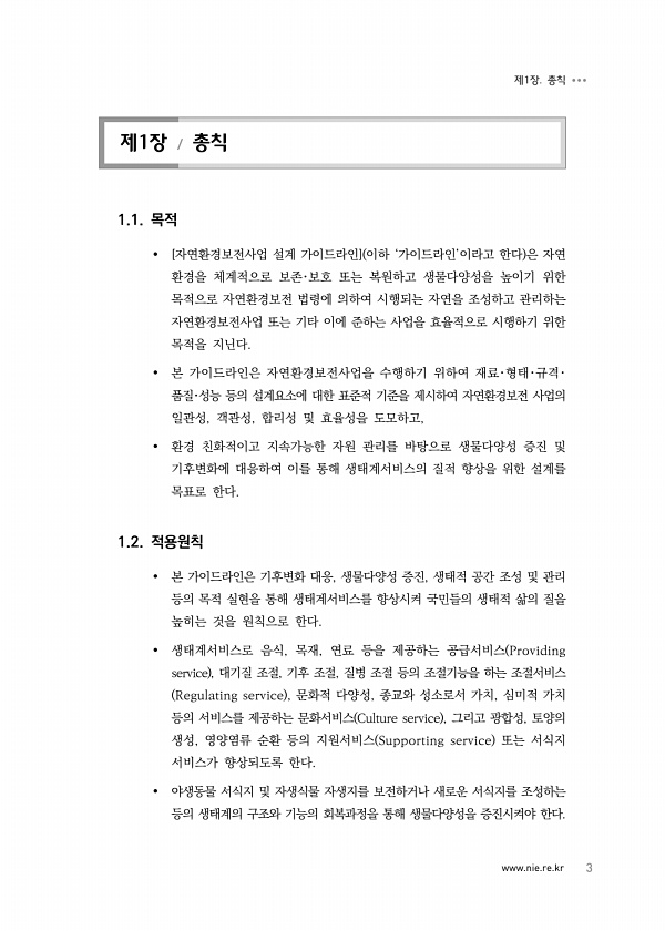 www.nie.re.kr 3 제1장. 총칙 제1장 총칙 1.1. 목적 [자연환경보전사업 설계 가이드라인] 이하 ‘가이드라인’이라고 한다 은 자연 환경을 체계적으로 보존?보호 또는 복원하고 생물다양성을 높이기 위한 목적으로 자연환경보전 법령에 의하여 시행되는 자연을 조성하고 관리하는 자연환경보전사업 또는 기타 이에 준하는 사업을 효율적으로 시행하기 위한 목적을 지닌다. 본 가이드라인은 자연환경보전사업을 수행하기 위하여 재료?형태?규격? 품질?성능 등의 설계요소에 대한 표준적 기준을 제시하여 자연환경보전 사업의 일관성, 객관성, 합리성 및 효율성을 도모하고, 환경 친화적이고 지속가능한 자원 관리를 바탕으로 생물다양성 증진 및 기후변화에 대응하여 이를 통해 생태계서비스의 질적 향상을 위한 설계를 목표로 한다. 1...