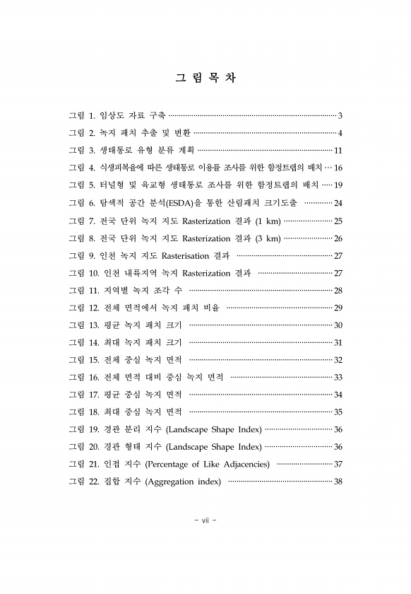 vii 그 림 목 차 그림 1. 임상도 자료 구축 ·················································································3 그림 2. 녹지 패치 추출 및 변환 ·····································································4 그림 3. 생태통로 유형 분류 계획 ·································································11 그림 4. 식생피복율에 따른 생태통로 이용률 조사를 위한 함정트랩의 배치··· 16 그림 5. 터널형 및 육교형 생태통로 조사를 위한 함정트랩의 배치 ····· 19 그림 6. 탐색적 공간 분석 E...