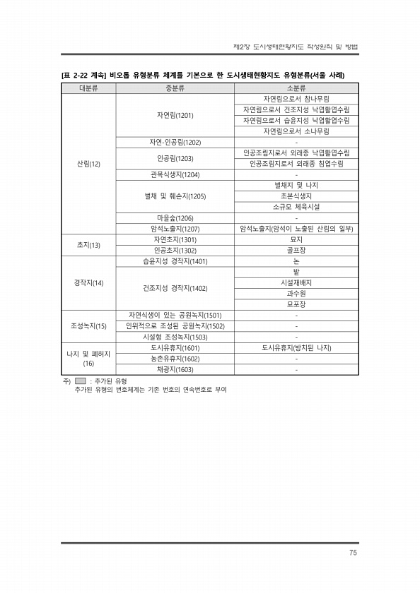 제2장 도시생태현황지도 작성원칙 및 방법 75 대분류 중분류 소분류 산림 12 자연림 1201 자연림으로서 참나무림 자연림으로서 건조지성 낙엽활엽수림 자연림으로서 습윤지성 낙엽활엽수림 자연림으로서 소나무림 자연-인공림 1202 인공림 1203 인공조림지로서 외래종 낙엽활엽수림 인공조림지로서 외래종 침엽수림 관목식생지 1204 벌채 및 훼손지 1205 벌채지 및 나지 초본식생지 소규모 체육시설 마을숲 1206 암석노출지 1207 암석노출지 암석이 노출된 산림의 일부 초지 13 자연초지 1301 묘지 인공초지 1302 골프장 경작지 14 습윤지성 경작지 1401 논 건조지성 경작지 1402 밭 시설재배지 과수원 묘포장 조성녹지 15 자연식생이 있는 공원녹지 1501 인위적으로 조성된 공원녹지 1502 시설형 조...