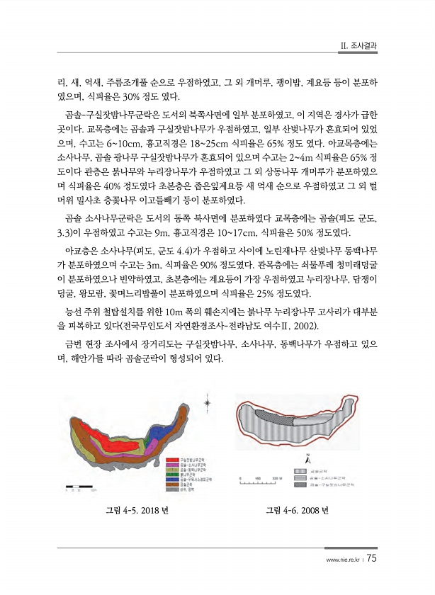 II. 조사결과 www.nie.re.kr ? 75 리, 새, 억새, 주름조개풀 순으로 우점하였고, 그 외 개머루, 괭이밥, 계요등 등이 분포하 였으며, 식피율은 30% 정도 였다. 곰솔-구실잣밤나무군락은 도서의 북쪽사면에 일부 분포하였고, 이 지역은 경사가 급한 곳이다. 교목층에는 곰솔과 구실잣밤나무가 우점하였고, 일부 산벚나무가 혼효되어 있었 으며, 수고는 610cm, 흉고직경은 1825cm 식피율은 65% 정도 였다. 아교목층에는 소사나무, 곰솔 광나무 구실잣밤나무가 혼효되어 있으며 수고는 24m 식피율은 65% 정 도이다 관층은 붉나무와 누리장나무가 우점하였고 그 외 상동나무 개머루가 분포하였으 며 식피율은 40% 정도였다 초본층은 좁은잎계요등 새 억새 순으로 우점하였고 그 외 털 머위 밀사초 층꽃나무...