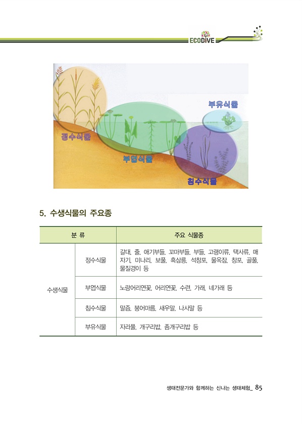 생태전문가와 함께하는 신나는 생태체험_ 85 5. 수생식물의 주요종 분 류 주요 식물종 수생식물 정수식물 갈대, 줄, 애기부들, 꼬마부들, 부들, 고랭이류, 택사류, 매 자기, 미나리, 보풀, 흑삼릉, 석창포, 물옥잠, 창포, 골풀, 물질경이 등 부엽식물 노랑어리연꽃, 어리연꽃, 수련, 가래, 네가래 등 침수식물 말즘, 붕어마름, 새우말, 나사말 등 부유식물 자라풀, 개구리밥, 좀개구리밥등