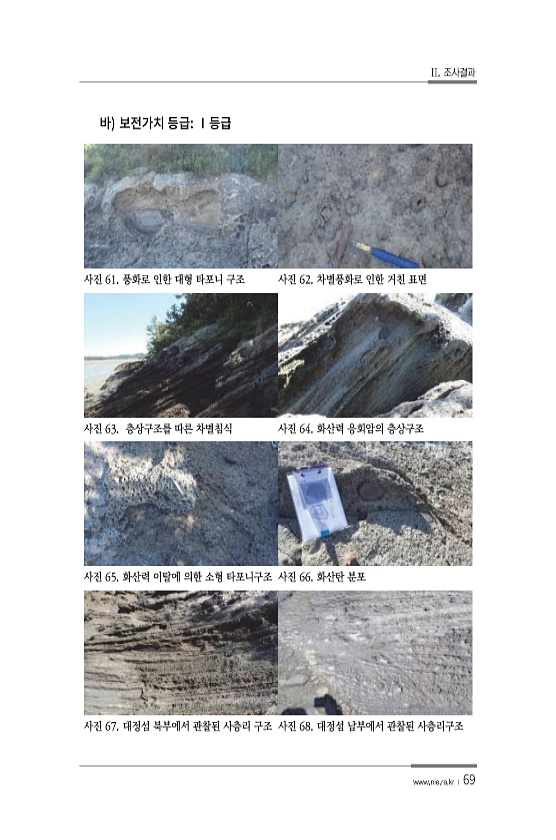 II. 조사결과 www.nie.re.kr ? 69 사진 61. 풍화로 인한 대형 타포니 구조 사진 62. 차별풍화로 인한 거친 표면 사진 63. 층상구조를 따른 차별침식 사진 64. 화산력 응회암의 층상구조 사진 65. 화산력 이탈에 의한 소형 타포니구조 사진 66. 화산탄 분포 사진 67. 대정섬 북부에서 관찰된 사층리 구조 사진 68. 대정섬 남부에서 관찰된사층리구조