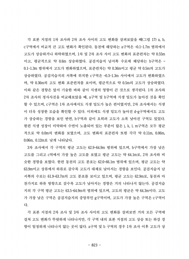 823 각 표본 지점의 1차 조사와 2차 조사 사이의 고도 변화를 살펴보았을 때 그림 17 a, b, c구역에서 비교적 큰 고도 변화가 확인된다. 동천에 해당하는 a구역은 ?0.11.7m 범위에서 고도가 상승하거나 하락하였으며, 1차 및 2차 조사 사이 고도 변화의 표준편차는 약 0.55m 이고, 평균적으로 약 0.6m 상승하였다. 공검지습지 남서쪽 수로에 해당하는 b구역은 ? 0.11.3m 범위에서 고도가 변화하였으며, 표준편차는 약 0.36m이고 평균 약 0.5m의 고도가 상승하였다. 공검지습지의 서쪽에 위치한 c구역은 ?0.31.3m 사이에서 고도가 변화하였으 며, 약 0.36m의 고도 변화 표준편차를 보이며, 평균적으로 약 0.5m의 고도가 상승하였다. 이와 같은 경향은 앞서 기술한 바와 같이 식생의...