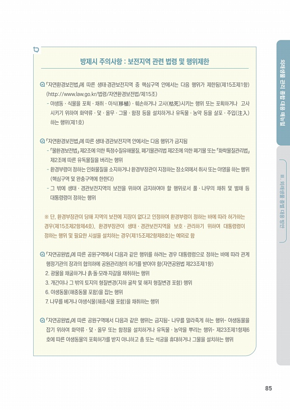85 외래생물 관리 종합 대응 매뉴얼 Ⅲ. 외래생물 종별 대응 방안 「자연환경보전법」에 따른 생태·경관보전지역 중 핵심구역 안에서는 다음 행위가 제한됨 제15조제1항 http//www.law.go.kr/법령/자연환경보전법/제15조 야생동ㆍ식물을 포획ㆍ채취ㆍ이식 移植 ㆍ훼손하거나 고사 枯死 시키는 행위 또는 포획하거나 고사 시키기 위하여 화약류ㆍ덫ㆍ올무ㆍ그물ㆍ함정 등을 설치하거나 유독물ㆍ농약 등을 살포ㆍ주입 注入 하는 행위 제1호 「자연환경보전법」에 따른 생태·경관보전지역 안에서는 다음 행위가 금지됨 「물환경보전법」 제2조에 의한 특정수질유해물질, 폐기물관리법 제2조에 의한 폐기물 또는 「화학물질관리법」 제2조에 따른 유독물질을 버리는 행위 환경부령이 정하는 인화물질을 소지하거나 환경부장관이 지정하는 장소외에...