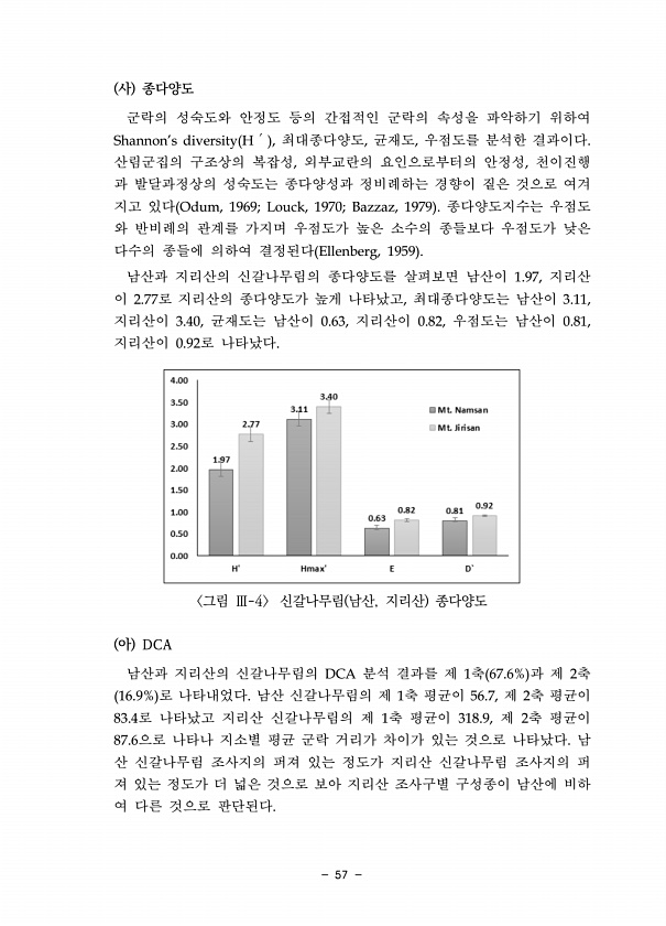 57 사 종다양도 군락의 성숙도와 안정도 등의 간접적인 군락의 속성을 파악하기 위하여 Shannon’s diversity H′ , 최대종다양도, 균재도, 우점도를 분석한 결과이다. 산림군집의 구조상의 복잡성, 외부교란의 요인으로부터의 안정성, 천이진행 과 발달과정상의 성숙도는 종다양성과 정비례하는 경향이 짙은 것으로 여겨 지고 있다 Odum, 1969; Louck, 1970; Bazzaz, 1979 종다양도지수는 우점도 와 반비례의 관계를 가지며 우점도가 높은 소수의 종들보다 우점도가 낮은 다수의 종들에 의하여 결정된다 Ellenberg, 1959 남산과 지리산의 신갈나무림의 종다양도를 살펴보면 남산이 1.97, 지리산 이 2.77로 지리산의 종다양도가 높게 나타났고, 최대종다양도는 남산이 3.11, 지리산...