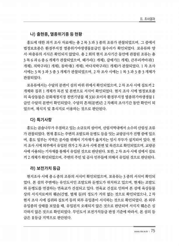 II. 조사결과 www.nie.re.kr ? 75 , 홍도에 대한 과거 조사 자료에는 총 2 목 3 과 3 종의 조류가 관찰되었으며, 그 중에서 법정보호종은 환경부지정 멸종위기야생생물Ⅱ급인 물수리가 확인되었다. 포유류와 양 서·파충류의 서식은 확인되지 않았다. 총 2 회의 현지 조사기간 동안에 관찰된 조류는 총 3 목 6 과 6 종 6 개체가 관찰되었으며, 왜가리 1 개체 , 갈매기 1 개체 , 큰부리까마귀 1 개체 , 직박구리 1 개체 , 동박새 1 개체 , 바다직박구리 1 개체 가 관찰되었다. 1 차 조사 시에는 3 목 3 과 3 종 3 개체가 관찰되었으며, 2 차 조사 시에는 1 목 3 과 3 종 3 개체가 관찰되었다. 포유류에서는 수달의 분변이 섬의 바위 위에서 확인되었으며, 2 차 조사 시에 집토끼...