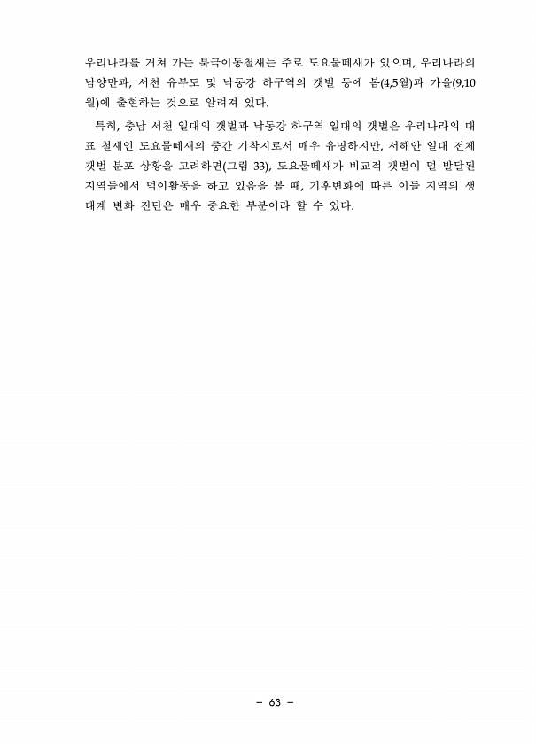 63 우리나라를 거쳐 가는 북극이동철새는 주로 도요물떼새가 있으며, 우리나라의 남양만과, 서천 유부도 및 낙동강 하구역의 갯벌 등에 봄 4,5월 과 가을 9,10 월 에 출현하는 것으로 알려져 있다. 특히, 충남 서천 일대의 갯벌과 낙동강 하구역 일대의 갯벌은 우리나라의 대 표 철새인 도요물떼새의 중간 기착지로서 매우 유명하지만, 서해안 일대 전체 갯벌 분포 상황을 고려하면 그림 33 , 도요물떼새가 비교적 갯벌이 덜 발달된 지역들에서 먹이활동을 하고 있음을 볼 때, 기후변화에 따른 이들 지역의 생 태계 변화 진단은 매우 중요한 부분이라 할 수있다.
