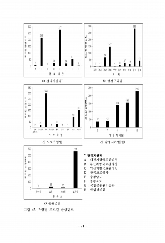71 a 관리기관별* b 행정구역별 d 도로유형별 e 발생시기별 월 * 관리기관명 A 대전지방국토관리청 B 부산지방국토관리청 C 익산지방국토관리청 D 한국도로공사 E 충청남도 F 충청북도 G 국립공원관리공단 H 국립생태원 c 분류군별 그림 45. 유형별 로드킬발생빈도