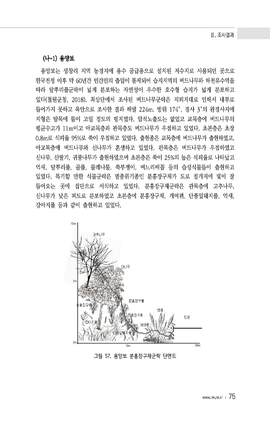 Ⅱ. 조사결과 www.nie.re.kr ? 75 나-1 용양보 용양보는 생창리 지역 농경지에 용수 공급용으로 설치된 저수지로 사용되던 곳으로 한국전쟁 이후 약 60년간 민간인의 출입이 통제되어 습지지역의 버드나무와 하천유수역을 따라 달뿌리풀군락이 넓게 분포하는 자연성이 우수한 호수형 습지가 넓게 분포하고 있다 철원군청, 2018 최상단에서 조사된 버드나무군락은 지뢰지대로 인해서 내부로 들어가지 못하고 육안으로 조사한 결과 해발 224m, 방위 174°, 경사 3°의 완경사지에 지형은 발목에 물이 고일 정도의 평지였다. 암석노출도는 없었고 교목층에 버드나무의 평균수고가 11m이고 아교목층과 관목층도 버드나무가 우점하고 있었다. 초본층은 초장 0.8m로 식피율 95%로 쑥이 우점하고 있었다. 출현종은 교목층에 ...