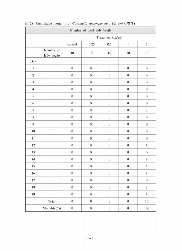 63 28. Cumulative mortality of Coccinella septempunctata Number of dead lady beetle Treatment ㎍/㎕ control 0.25 0.5 1 2 Number of lady beetle 10 10 10 10 10 Day 1 0 0 0 0 0 2 0 0 0 0 0 3 0 0 0 0 0 4 0 0 0 0 0 5 0 0 0 0 0 6 0 0 0 0 0 7 0 0 0 0 2 8 0 0 0 0 0 9 0 0 0 0 0 10 0 0 0 0 0 11 0 0 0 0 0 12 0 0 0 0 1 13 0 0 0 0 0 14 0 0 0 0 1 15 0 0 0 0 1 16 0 0 0 0 1 17 0 0 0 0 0 18 0 0 0 0 3 19 0 0 0 0 1 To...