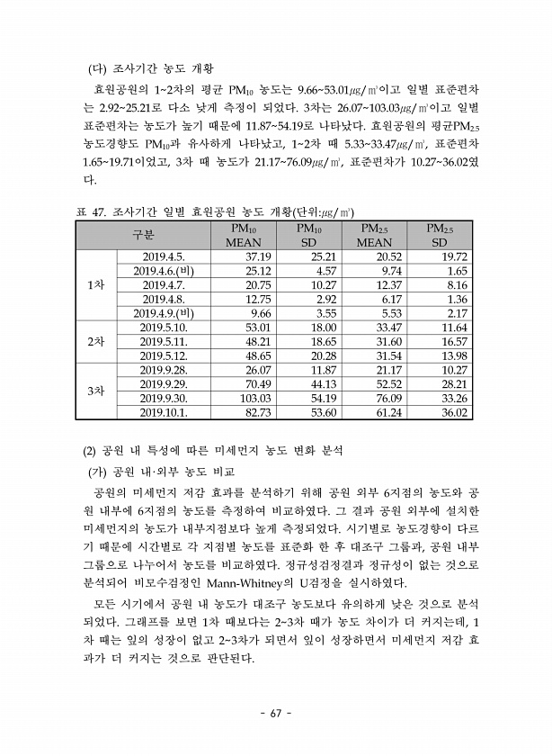 67 다 조사기간 농도 개황 효원공원의 12차의 평균 PM10 농도는 9.6653.01㎍/㎥이고 일별 표준편차 는 2.9225.21로 다소 낮게 측정이 되었다. 3차는 26.07103.03㎍/㎥이고 일별 표준편차는 농도가 높기 때문에 11.8754.19로 나타났다. 효원공원의 평균PM2.5 농도경향도 PM10과 유사하게 나타났고, 12차 때 5.3333.47㎍/㎥, 표준편차 1.6519.71이었고, 3차 때 농도가 21.1776.09㎍/㎥, 표준편차가 10.2736.02였 다. 구분 PM10 MEAN PM10 SD PM2.5 MEAN PM2.5 SD 1차 2019.4.5. 37.19 25.21 20.52 19.72 2019.4.6. 비 25.12 4.57 9.74 1.65 2019.4.7. 20.75 10....