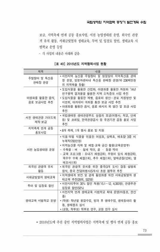 국립생태원 지역협력 중장기 발전계획 수립 73 보급, 지역축제 연계 공동 홍보사업, 서천 농업생태원 운영, 외국인 관광 객 유치 활동, 서해금빛열차 생태교육, 투어 및 입장료 할인, 생태교육 시 범학교 운영 등임 각 사업의 내용은 아래와 같음 [표 40] 2015년도 지역협력사업 현황 제목 내용 주말장터 및 특산품 판매장 운영 서천지역 농산물 주말장터 및 명절맞이 지역특산품 판매 장 운영, 방문자센터내 특산품 판매장 운영 약 236백만원 의 지역매출 창출 야생화를 활용한 음식, 음료 보급사업 추진 도입식물을 활용한 산업화, 야생화를 활용한 자원화 ’14년 연구용역 결과물을 활용한 지역 소득증대 사업 추진 도입식물을 활용한 제빵, 음료의 생산?판로 지원방안 및 시연회, 아카데미 개최를 통한 보급 사업 추진...