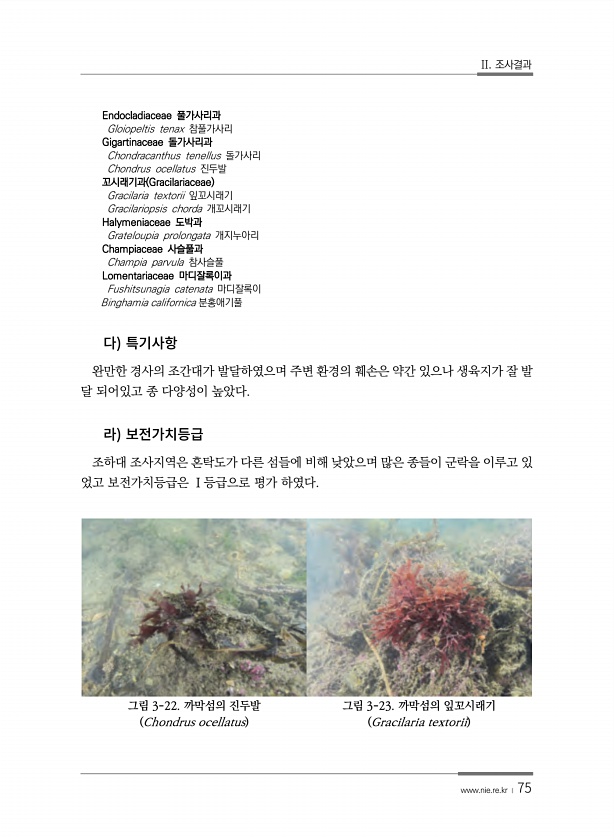 II. 조사결과 www.nie.re.kr ? 75 Endocladiaceae 풀가사리과 Gloiopeltis tenax 참풀가사리 Gigartinaceae 돌가사리과 Chondracanthus tenellus 돌가사리 Chondrus ocellatus 진두발 꼬시래기과 Gracilariaceae Gracilaria textorii 잎꼬시래기 Gracilariopsis chorda 개꼬시래기 Halymeniaceae 도박과 Grateloupia prolongata 개지누아리 Champiaceae 사슬풀과 Champia parvula 참사슬풀 Lomentariaceae 마디잘록이과 Fushitsunagia catenata 마디잘록이 Binghamia californica 분홍애기풀 완만한 경사의 조간대가 발달하...