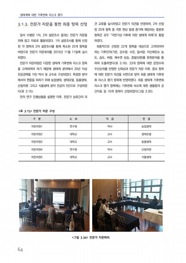 생태계에 대한 기후변화 리스크 평가 64 3.1.3. 전문가 자문을 통한 최종 항목 선정 앞서 수행된 1차, 2차 설문조사 결과는 전문가 자문을 위해 참고 자료로 활용되었다. 1차 설문조사를 통해 선정 된 각 항목과 2차 설문조사를 통해 축소된 25개 항목을 바탕으로 전문가 자문회의를 2015년 11월 11일에 실시 하였다. 전문가 자문위원은 다양한 생태계 기후변화 리스크 항목 을 고려하여야 하기 때문에 생태계 분야에서 20년 이상 전공경력을 가진 박사 및 교수로 구성되었다. 특정한 분야 에서의 편중을 피하기 위해 농업생태, 생태모델, 동물생태, 산림자원 그리고 식물생태 분야 전공자 5인으로 구성하였 다 표 3.15 먼저 연구 진행상황을 설명한 이후, 전문가 상호간의 의 견 교류를 실시하였고 전문가 의견을 ...