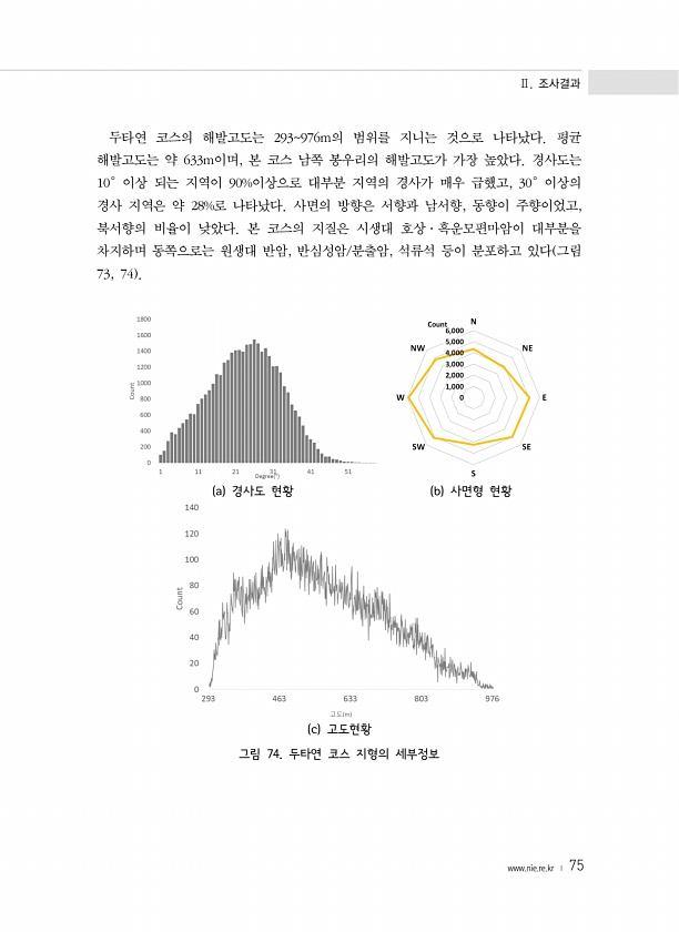 Ⅱ. 조사결과 www.nie.re.kr ? 75 두타연 코스의 해발고도는 293976m의 범위를 지니는 것으로 나타났다. 평균 해발고도는 약 633m이며, 본 코스 남쪽 봉우리의 해발고도가 가장 높았다. 경사도는 10°이상 되는 지역이 90%이상으로 대부분 지역의 경사가 매우 급했고, 30°이상의 경사 지역은 약 28%로 나타났다. 사면의 방향은 서향과 남서향, 동향이 주향이었고, 북서향의 비율이 낮았다. 본 코스의 지질은 시생대 호상·흑운모편마암이 대부분을 차지하며 동쪽으로는 원생대 반암, 반심성암/분출암, 석류석 등이 분포하고 있다 그림 73, 74 a 경사도 현황 b 사면형 현황 c 고도현황 그림 74. 두타연 코스 지형의세부정보