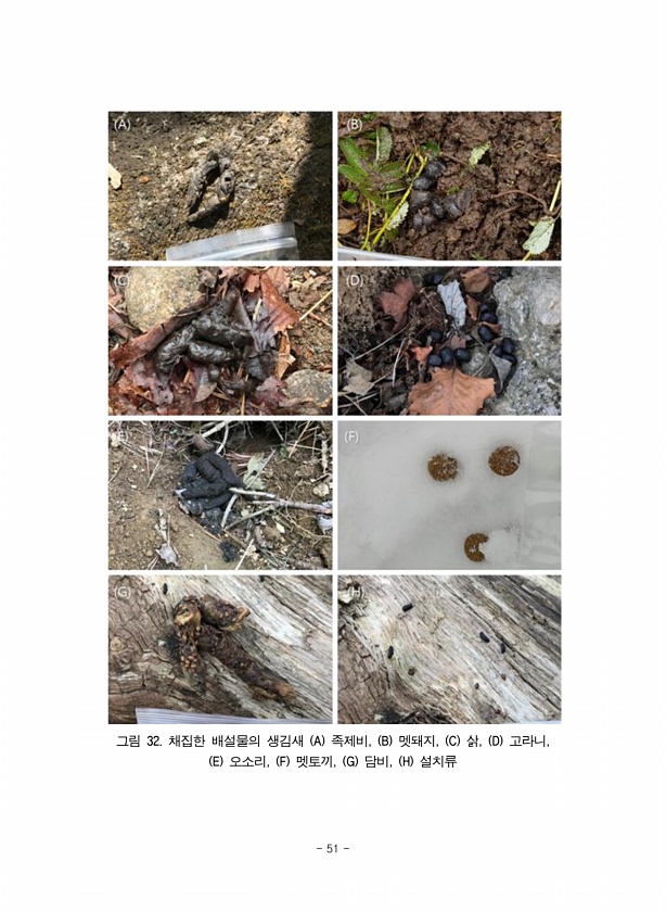그림 32. 채집한 배설물의 생김새 A 족제비, B 멧돼지, C 삵, D 고라니, E 오소리, F 멧토끼, G 담비, H 설치류 51